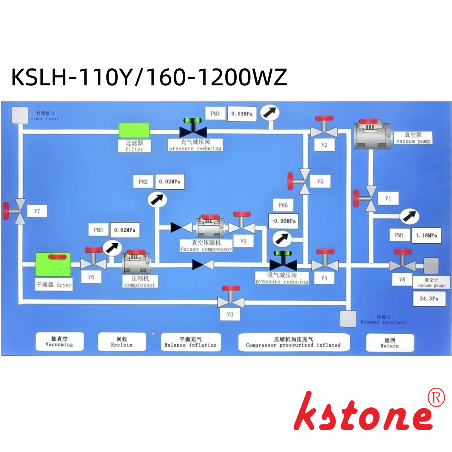 تم تحسين نظام الأتمتة الكبير الكفاءة KSLH-110Y/160-1200WZ لمواجهة اختبار الجهد من خزانات العزل 550kV في شبكة الكهرباء.إنه يدمج ضاغط رئيسي بمكبس 110m3 / h خالي من الزيت ومبرد بالهواءضاغط الضغط السلبي 160m3/h (≤ 5Pa فراغ نهائي) ، مضخة فراغ خط الأنابيب 63m3/h (≤ 5Pa فراغ نهائي) وخزان تخزين أفقي من الفولاذ المقاوم للصدأ 304 1200L ،خزان تخزين معدني من الفولاذ الكربوني (اختياري)، لإدارة فعالة لـ SF6 عالي الضغط.
